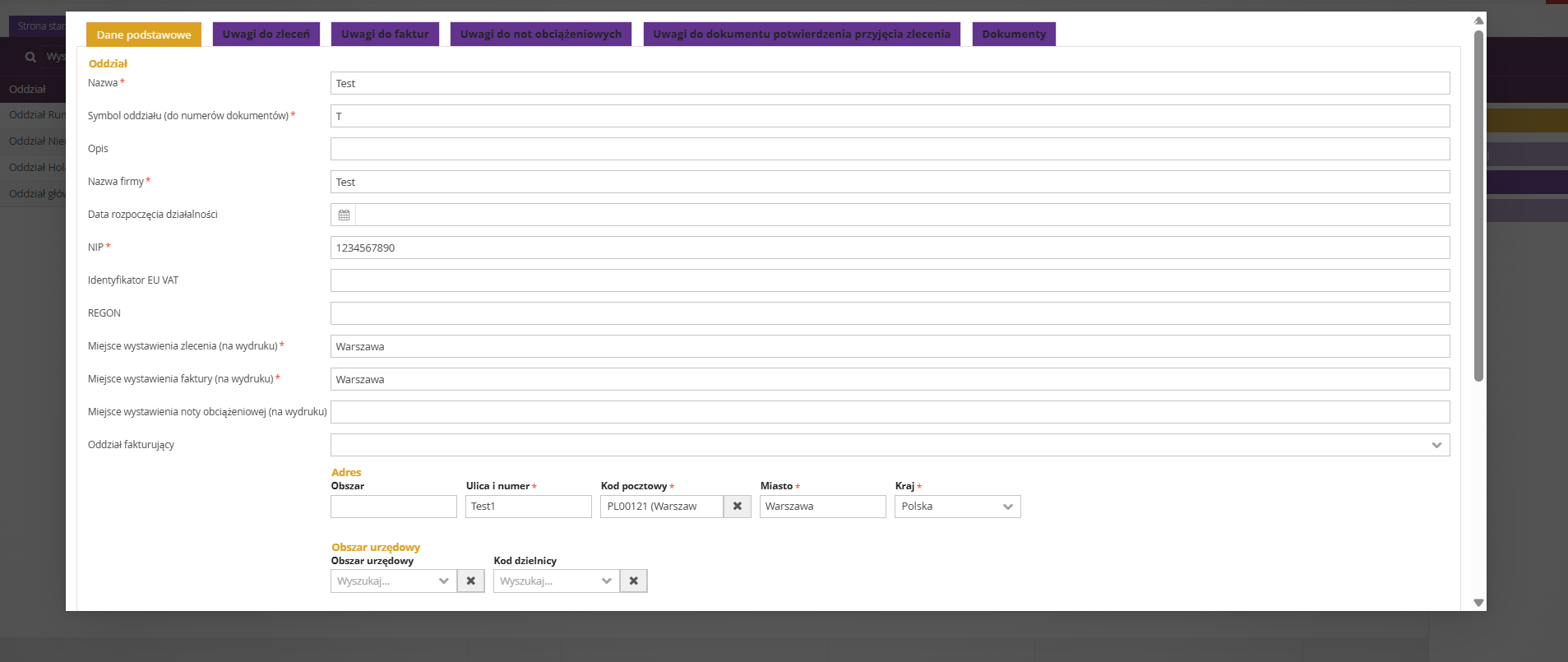 2. Następnie w zakładce Dane podstawowe należy uzupełnić informacje dotyczące nowo dodawanego oddziału, takie jak: