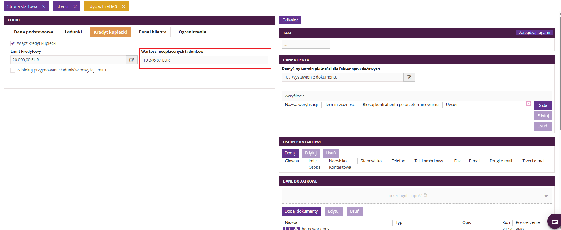 4. fireTMS pozwala również na blokadę przyjmowania ładunków powyżej ustawionego limitu kredytowego.