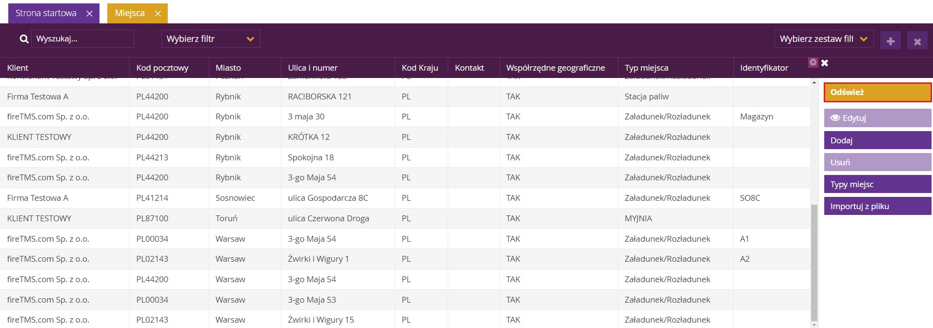 Uwaga! Zaimportowane miejsca pojawią się na liście dopiero po kliknięciu Odśwież (lub po zamknięciu zakładki i uruchomieniu jej na nowo).