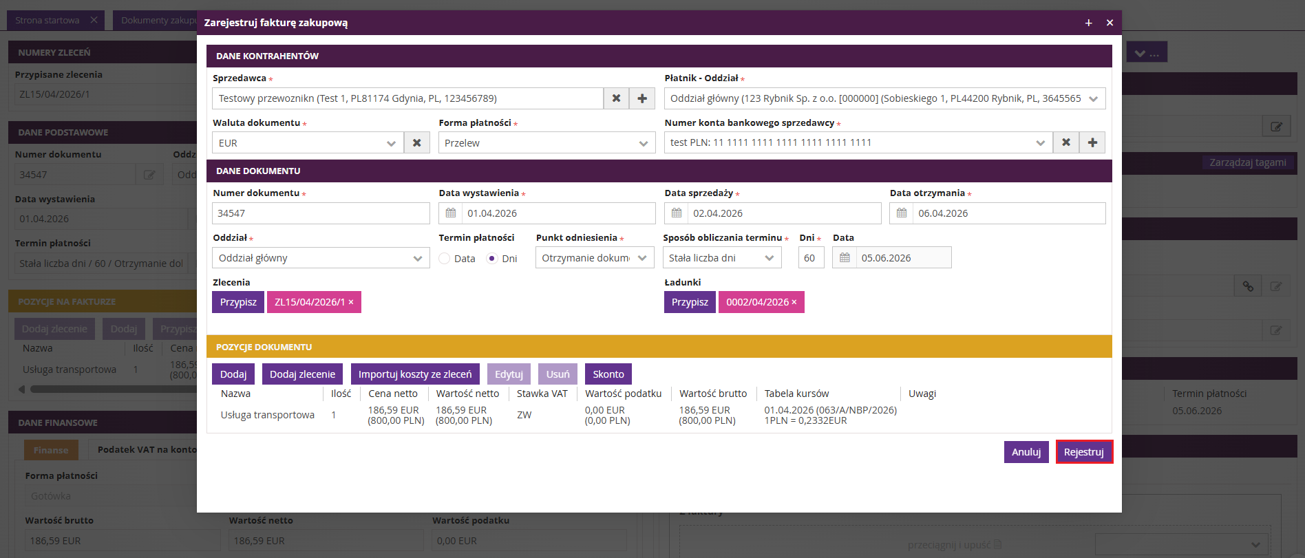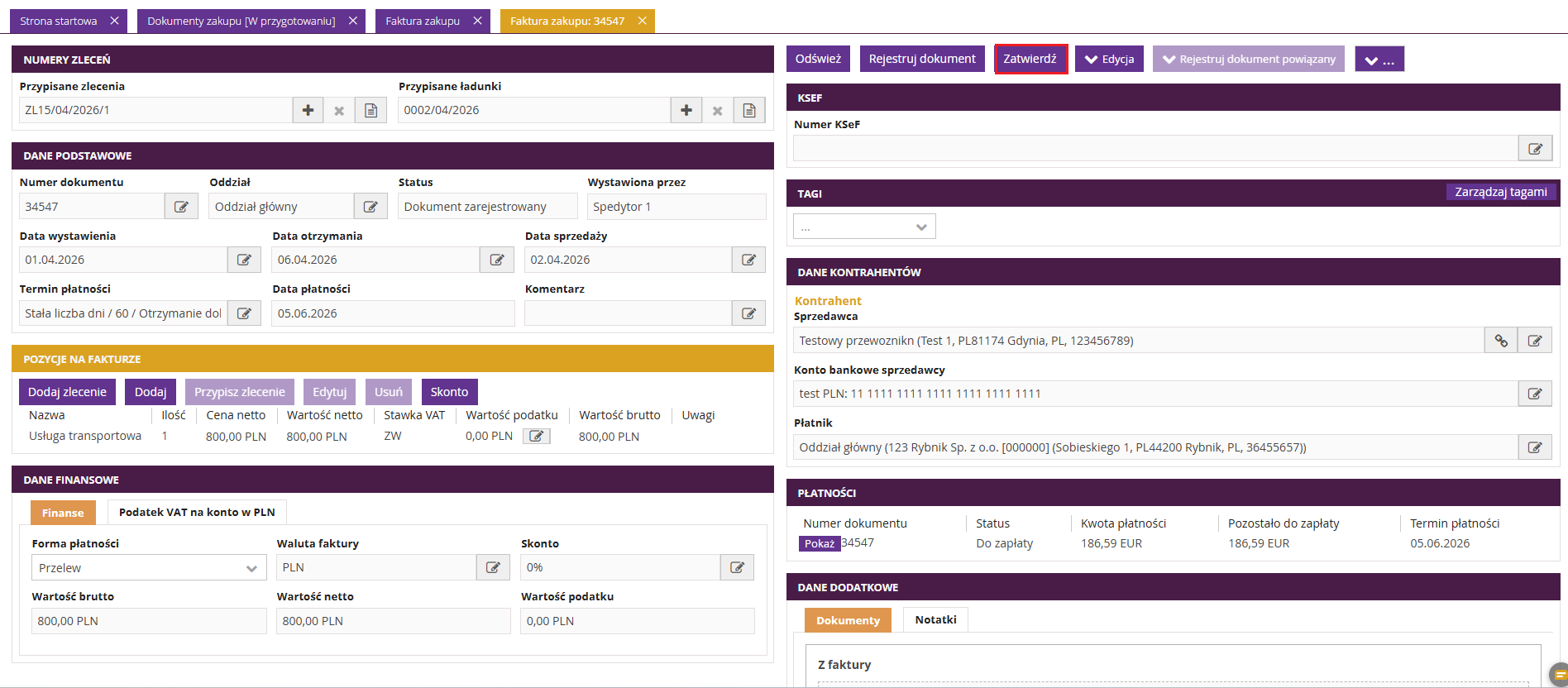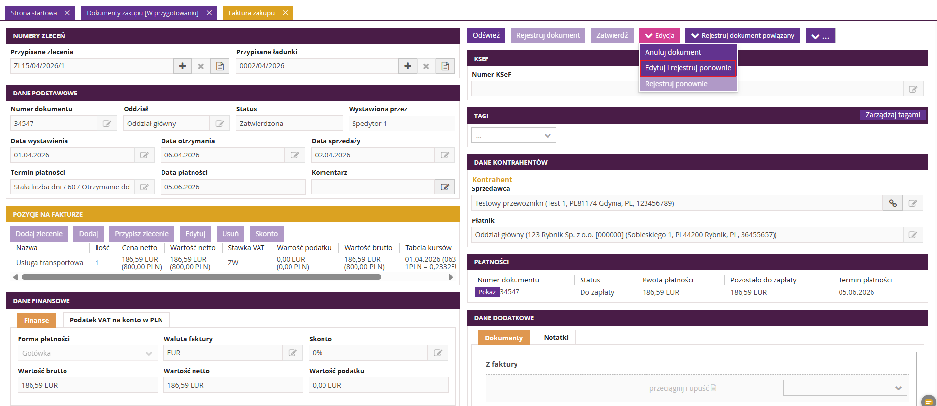 W fireTMS możliwa jest edycja faktur zakupu, które zostały zarejestrowane w systemie.