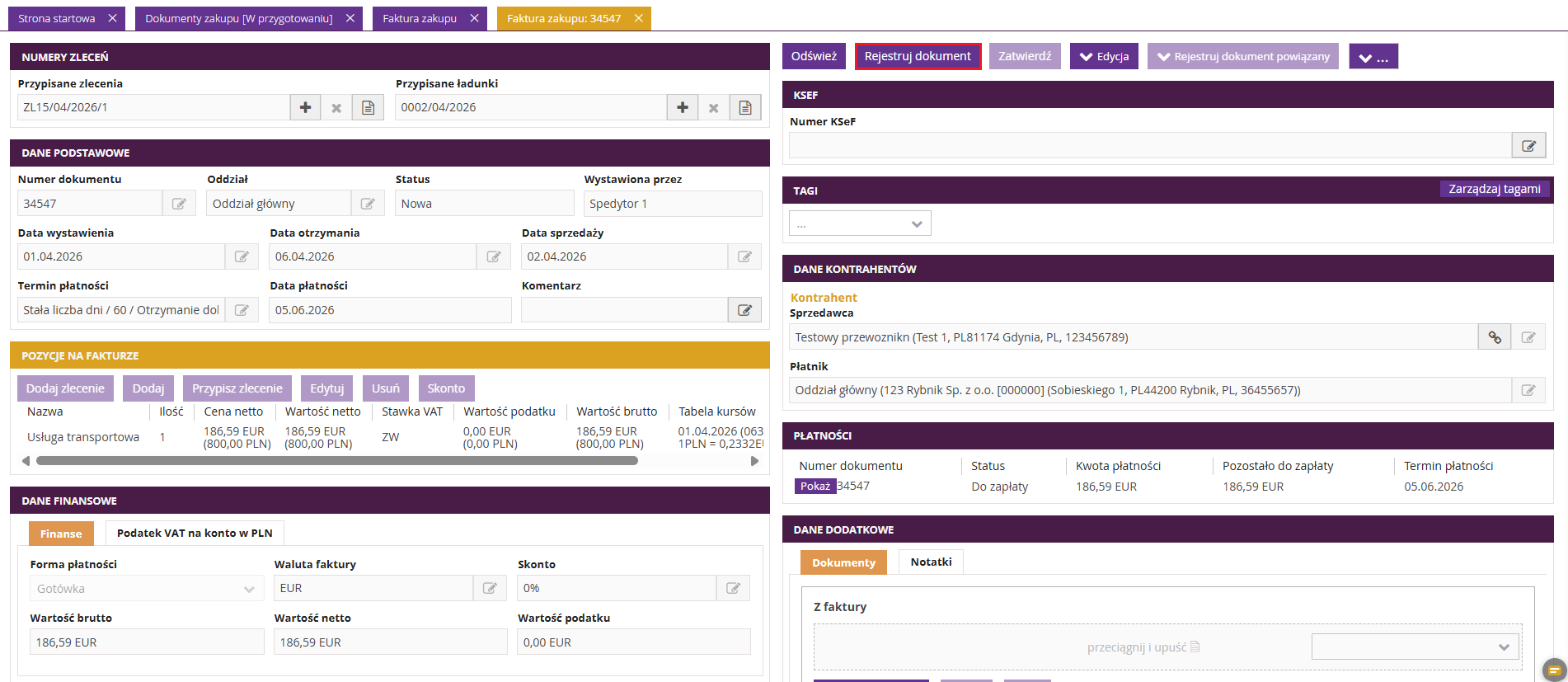 Po wybraniu opcji Edytuj i rejestruj ponownie, faktura zakupu automatycznie otrzymuje status Nowa. Aby dokonać zmian w fakturze zakupu, należy użyć opcji Rejestruj dokument.