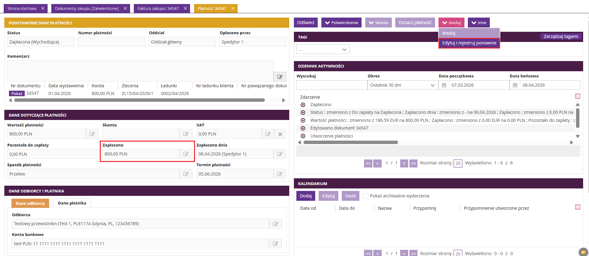 Gdy płatność powiązana z fakturą zakupu zostanie oznaczona jako Zapłacona, aby dokonać jej edycji, należy najpierw przejść do tej płatności i zmienić jej status na Do zapłaty. W tym celu w płatności należy użyć opcji Anuluj >> Edytuj i rejestruj ponownie, a następnie w polu Zapłacono wpisać kwotę 0. Po dokonaniu tych zmian możliwe będzie edytowanie faktury zakupu według instrukcji z pkt 1.