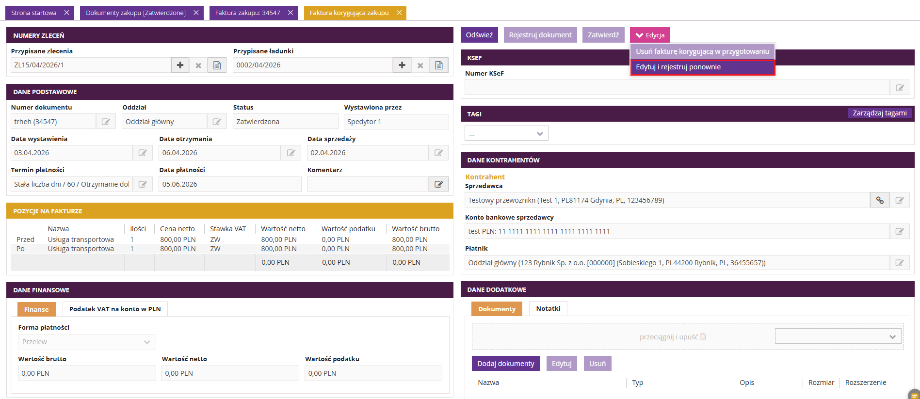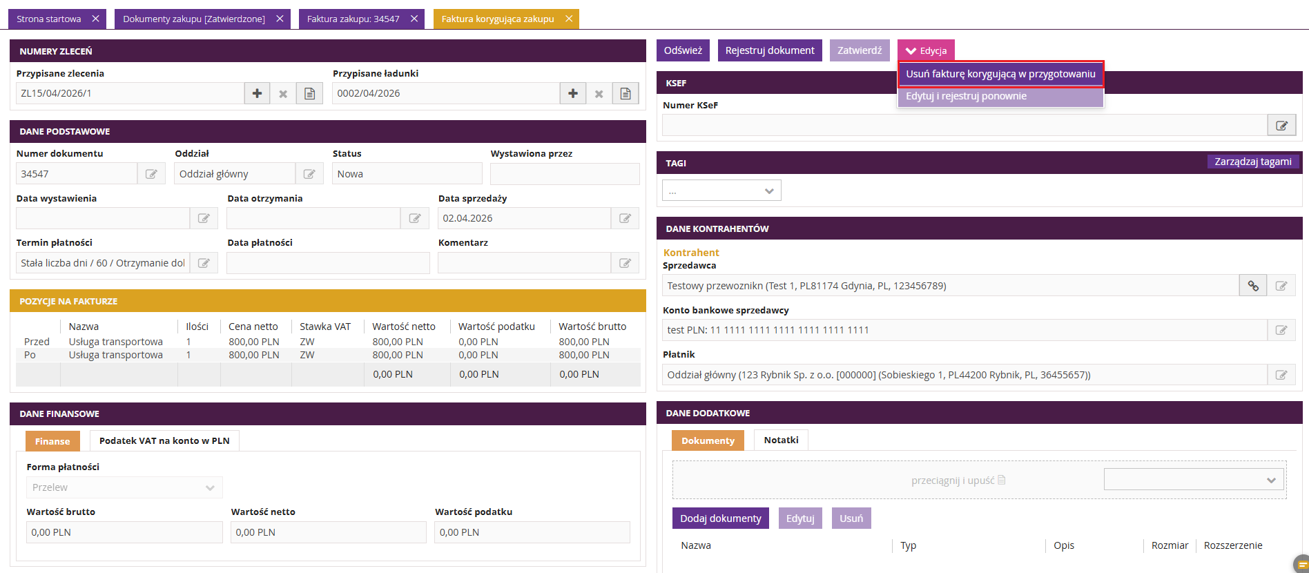 1. Edycja zarejestrowanej i zatwierdzonej faktury zakupu