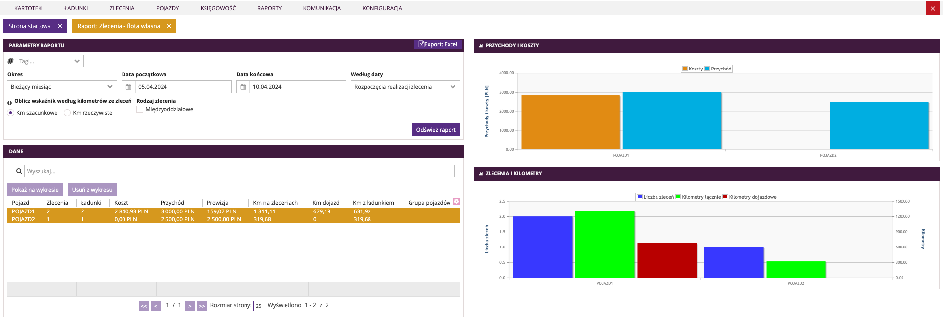 Raport Zlecenia - flota własna przedstawia dane dotyczące zleceń realizowanych przez własny tabor.
