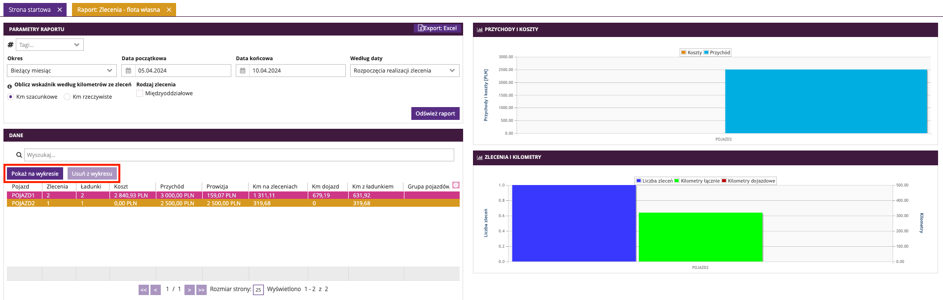 Opcja Pokaż na wykresie lub Usuń na wykresie pozwala wyświetlać lub usuwać dane z wykresów Przychody i koszty, Zlecenia i kilometry z prawej strony.