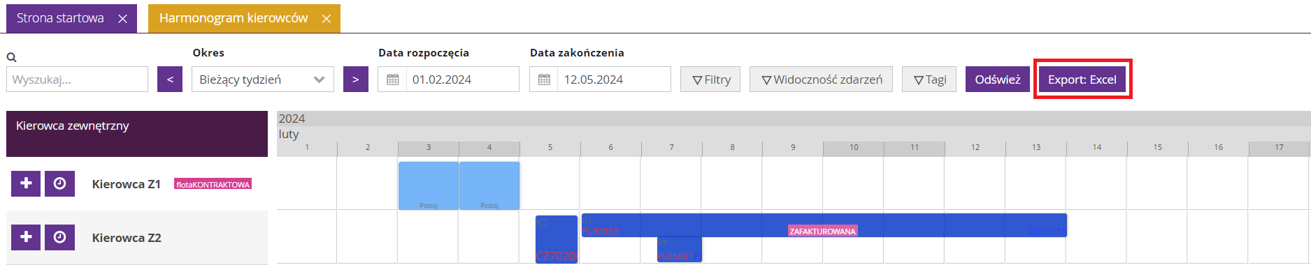 Istnieje również możliwość wyeksportowania danych z harmonogramu do pliku Excel. W tym celu po prawej stronie wybierz opcję Export: Excel.