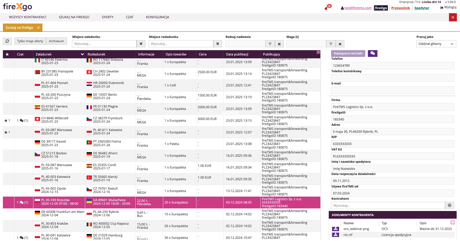 Miejsce załadunku - pozwala na określenie kodu pocztowego miejsca załadunku oraz wybór promienia [km]
