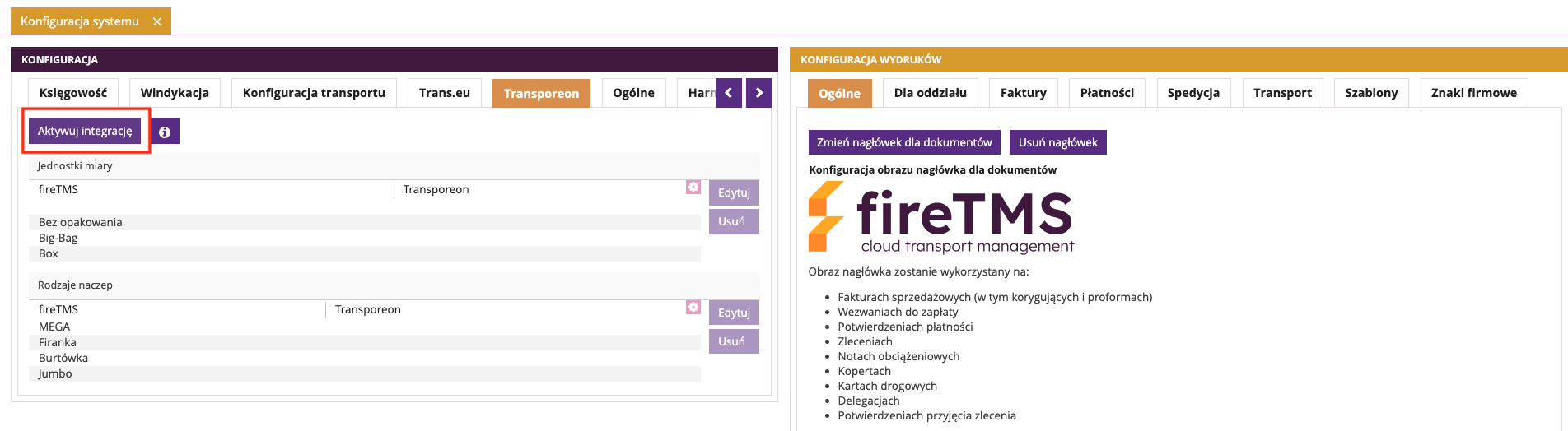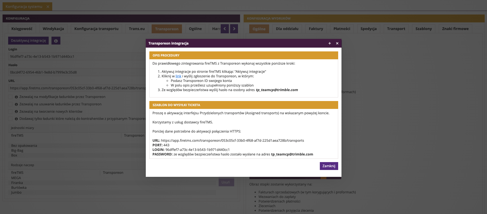 Aktywacja integracji dostępna jest w Konfiguracja >> Konfiguracja systemu >> zakładka Transporeon. Po uruchomieniu funkcji Aktywuj integrację udostępniany jest zestaw informacji wymaganych przez Transporeon do uruchomienia połączenia.