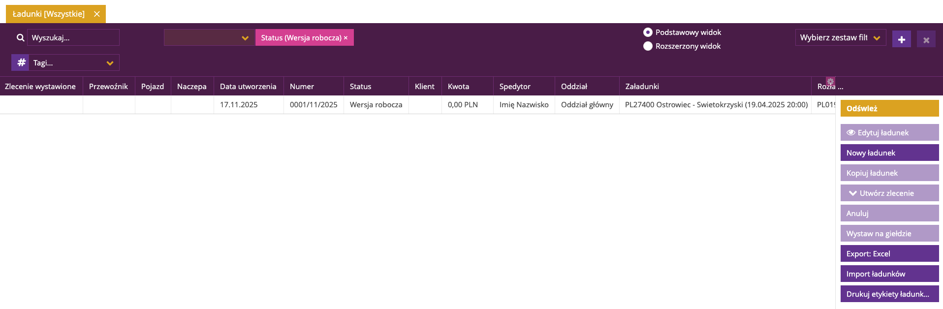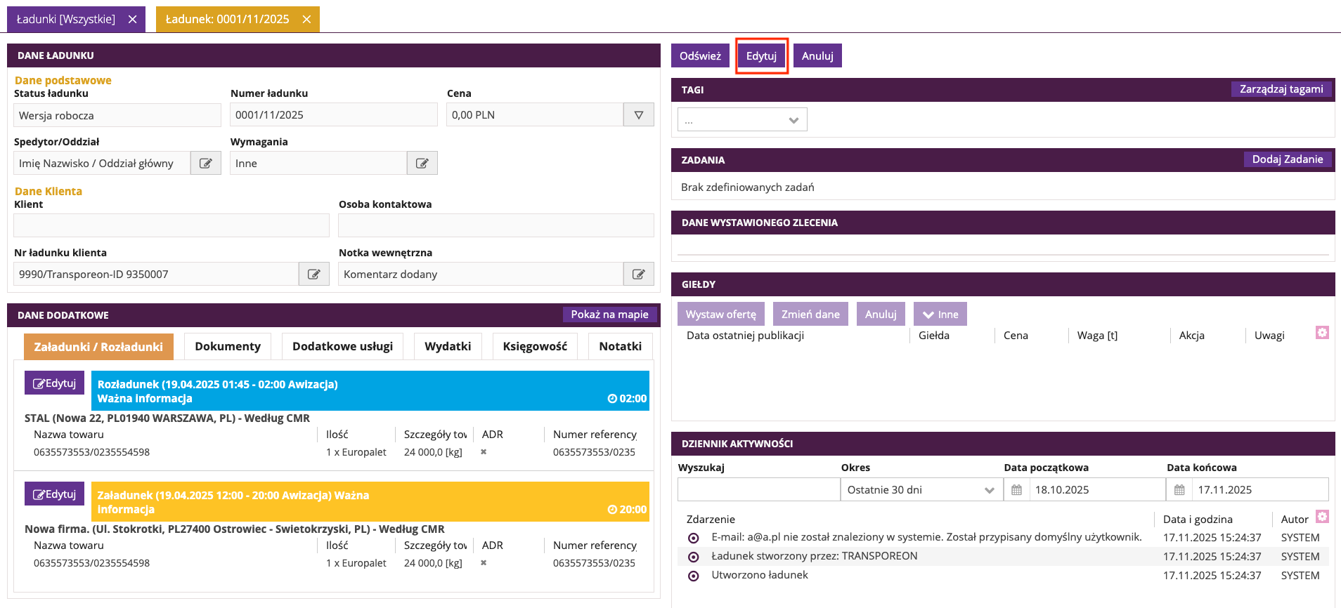 W celu stworzenia ładunku do dyspozycji z tego obiektu należy wykonać edycję, która jest dostępna po prawej stronie listy — opcja Edytuj ładunek.