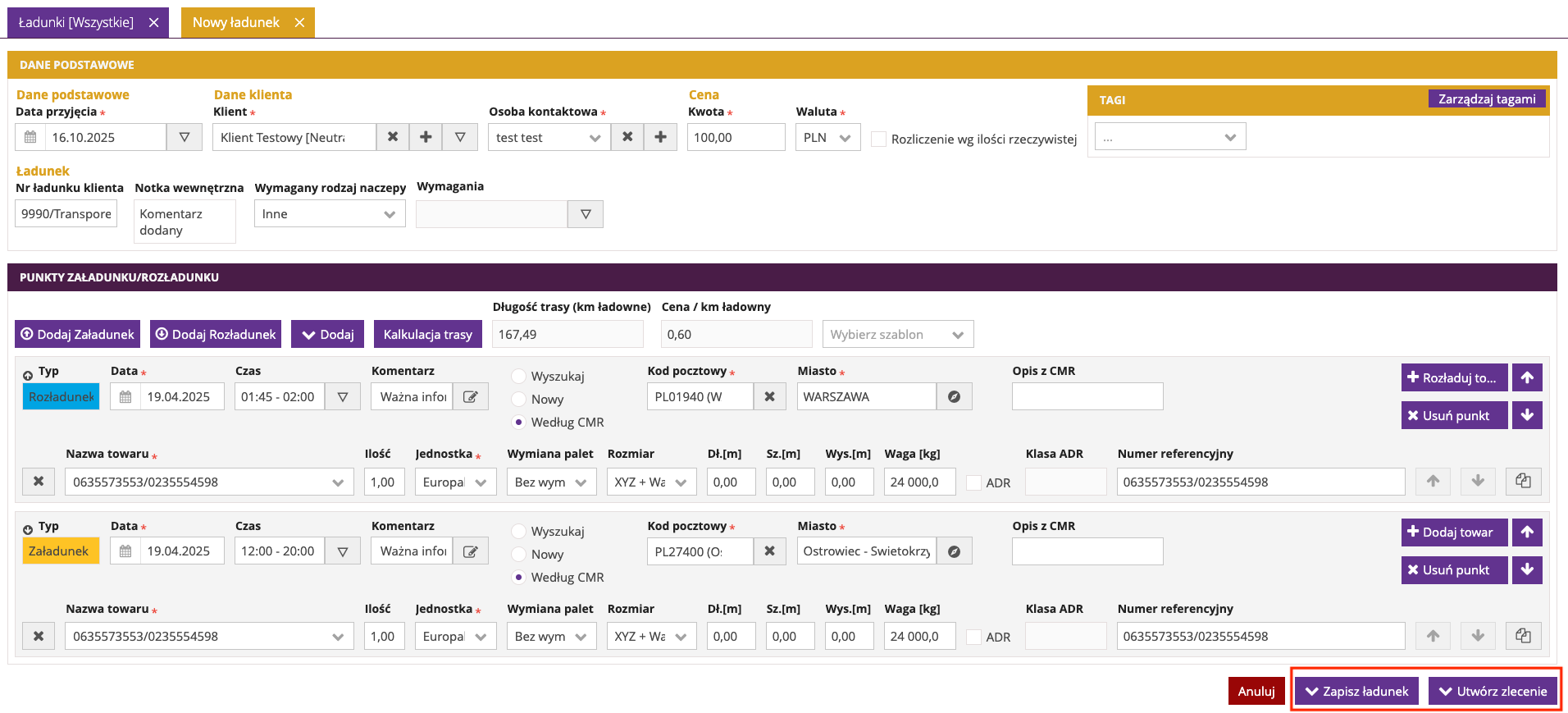Zapisz ładunek >> Zapisz bez tworzenia zlecenia – zapis ładunku bez generowania zlecenia (ładunek będzie dostępny na liście Ładunki >> Ładunki do dyspozycji),