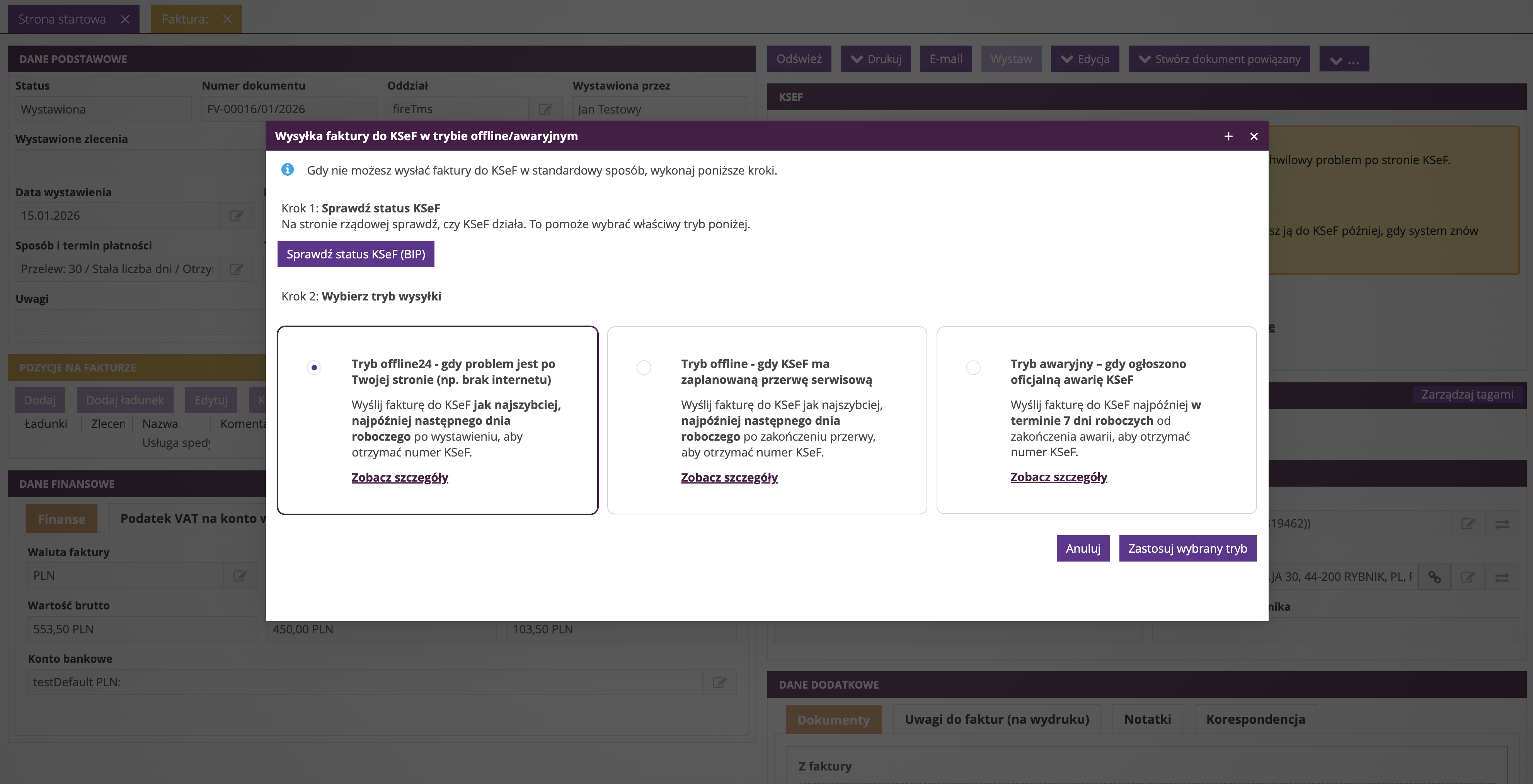 • Kliknij Zastosuj wybrany tryb, aby kontynuować proces wystawiania faktury.