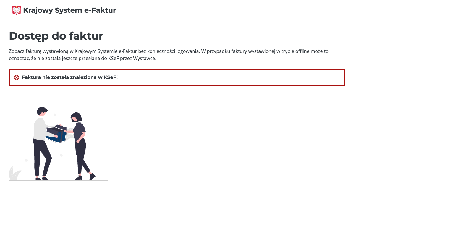 Zawiera link do faktury w KSeF lub do strony umożliwiającej jej weryfikację. Jeśli faktura nie została jeszcze wysłana, na stronie KSeF pojawi się komunikat Faktura nie została znaleziona w KSeF.