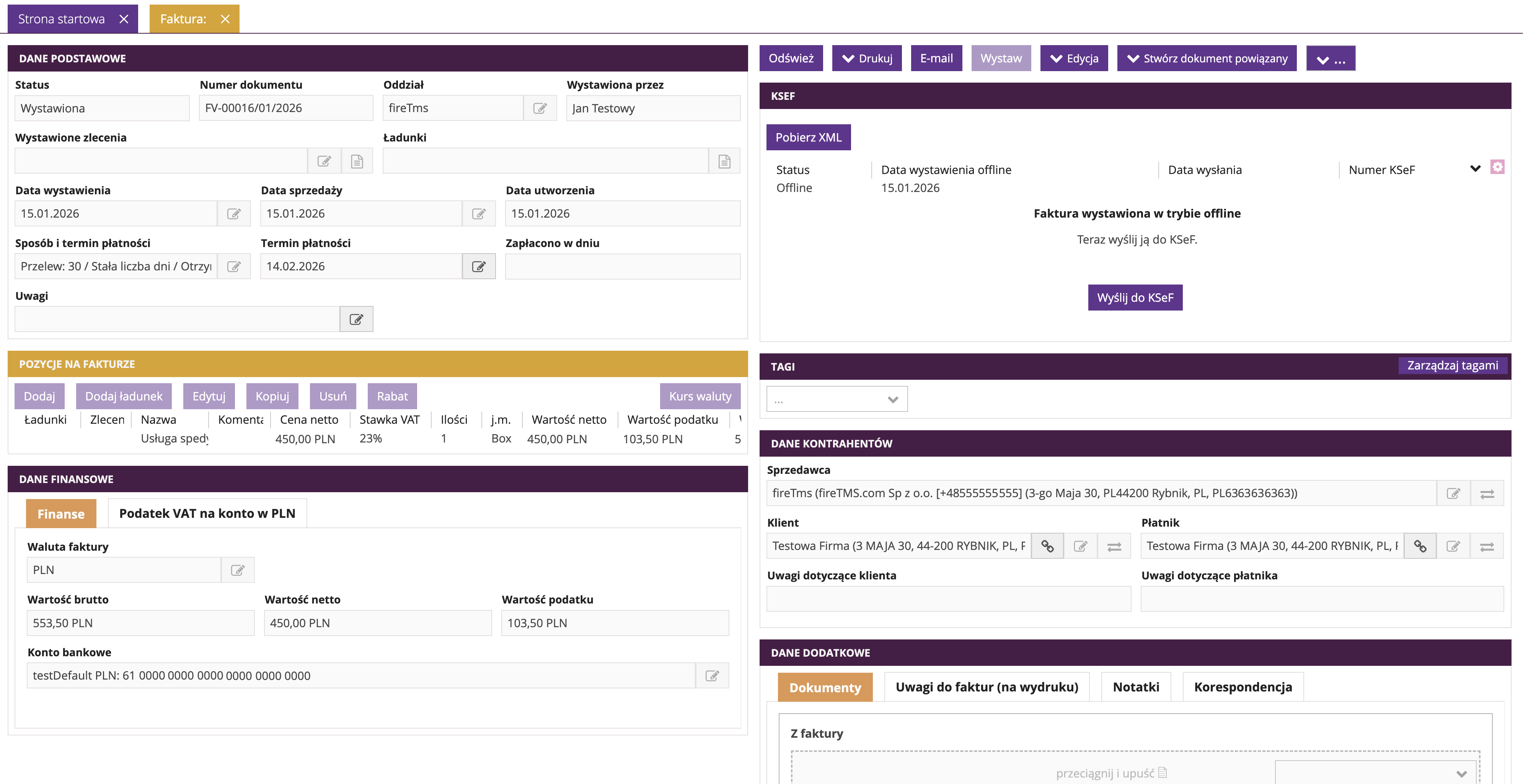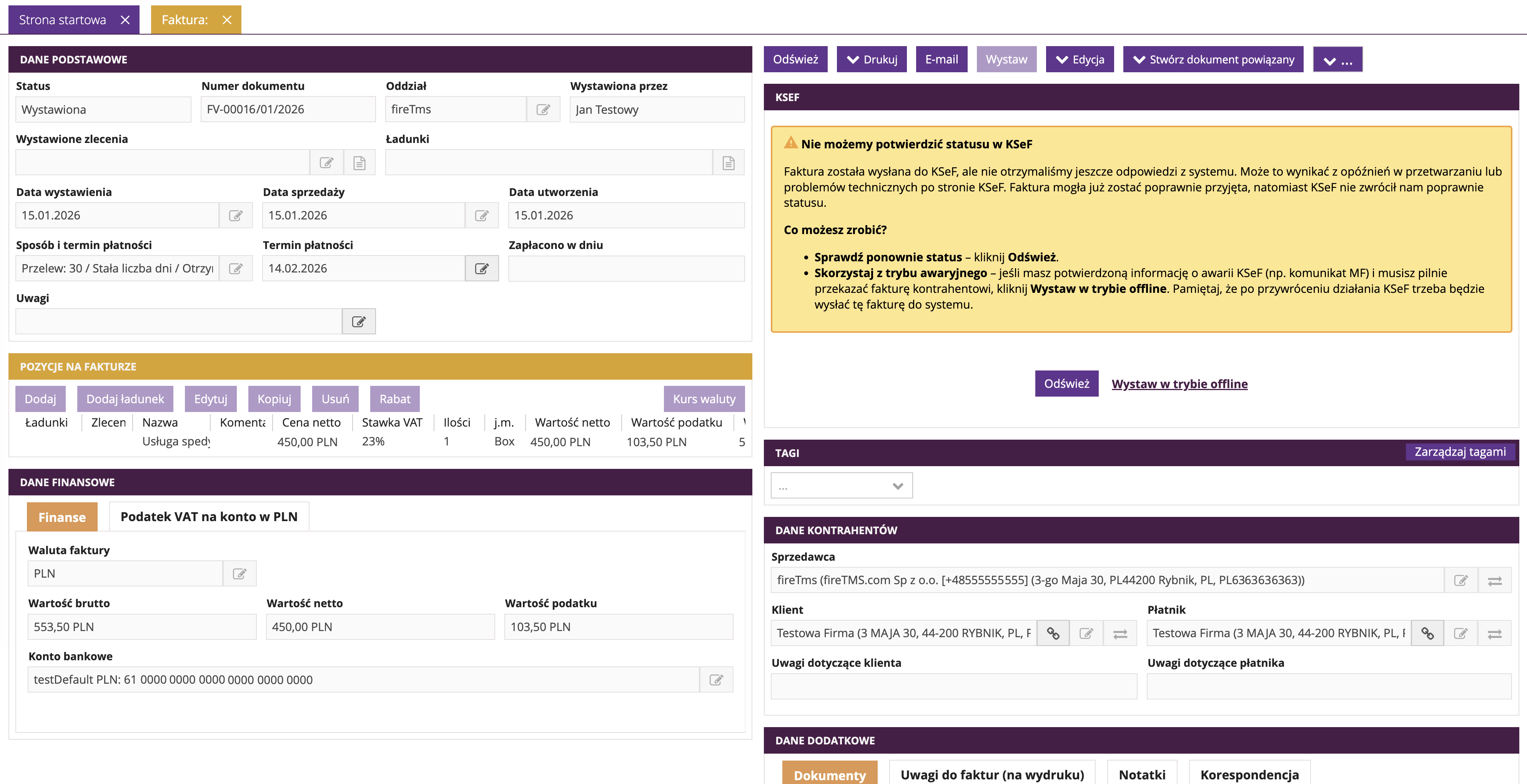 Tryb offline (lub awaryjny) umożliwia wystawienie faktury sprzedaży w sytuacji, gdy bieżąca wysyłka dokumentu do KSeF nie jest możliwa. Aby możliwe było wystawianie faktur sprzedaży w trybie offline w systemie fireTMS, konieczne jest wcześniejsze dodanie certyfikatu KSeF typu offline.