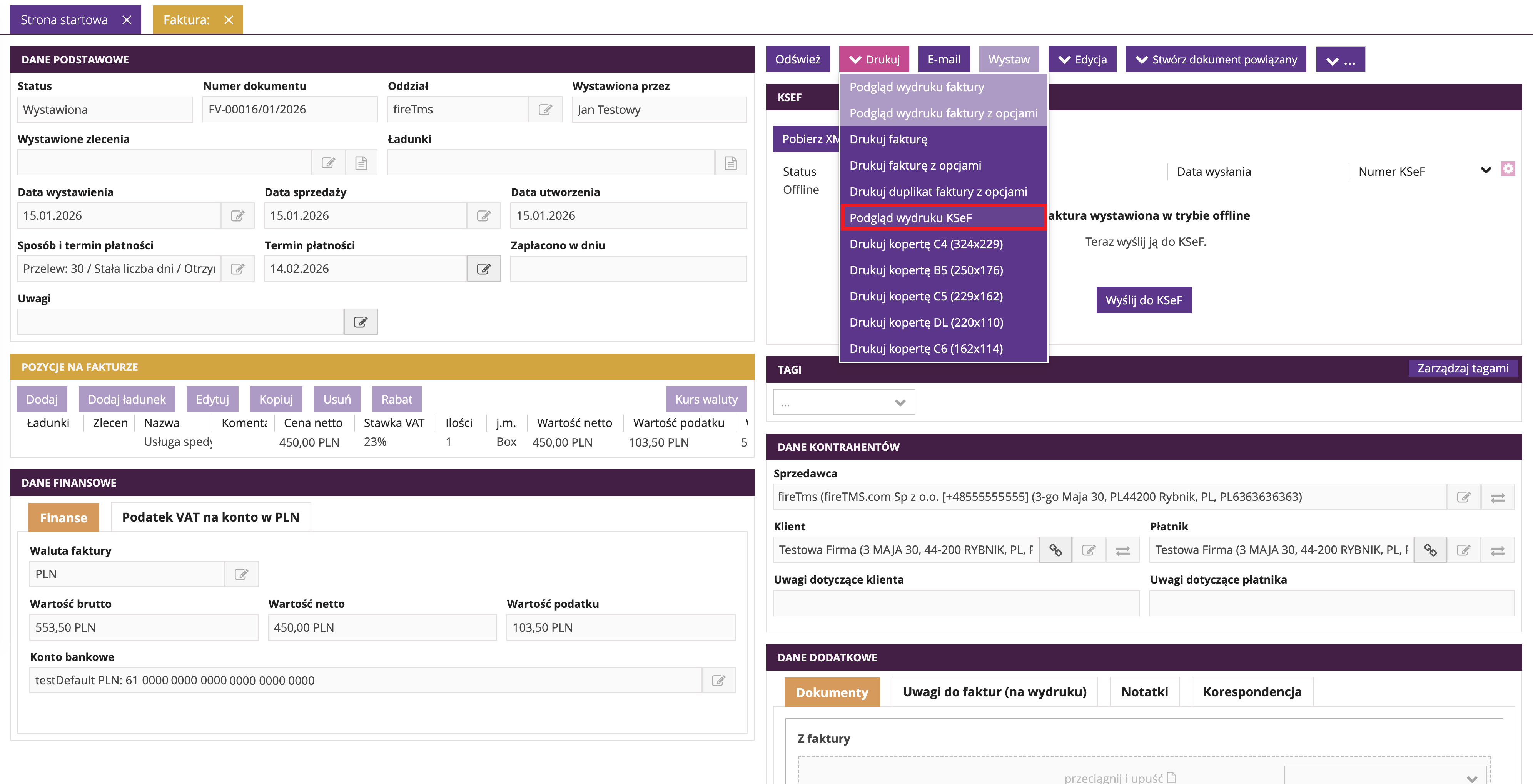 Uwaga: Opcja Podgląd wydruku KSeF jest dostępna wyłącznie na środowisku demonstracyjnym w celu wyświetlenia wizualizacji faktury KSeF. Na środowisku produkcyjnym, każda wystawiona faktura posiada domyślnie numer KSeF, kod QR oraz link weryfikacyjny.