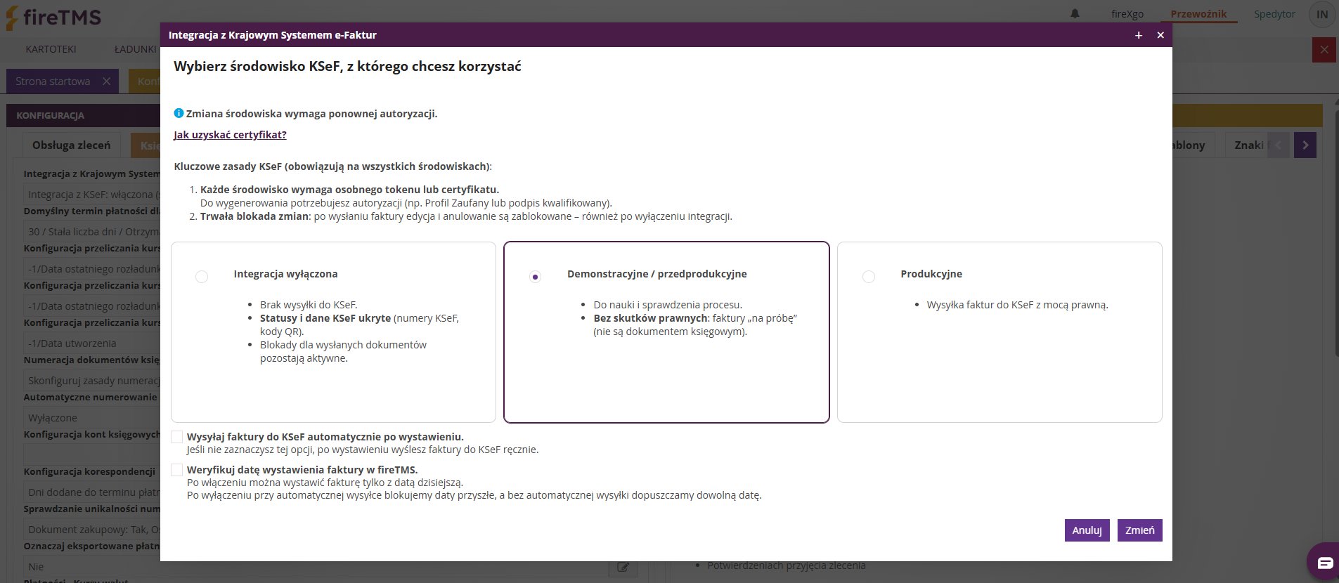 Konfiguracja środowiska KSeF w systemie fireTMS