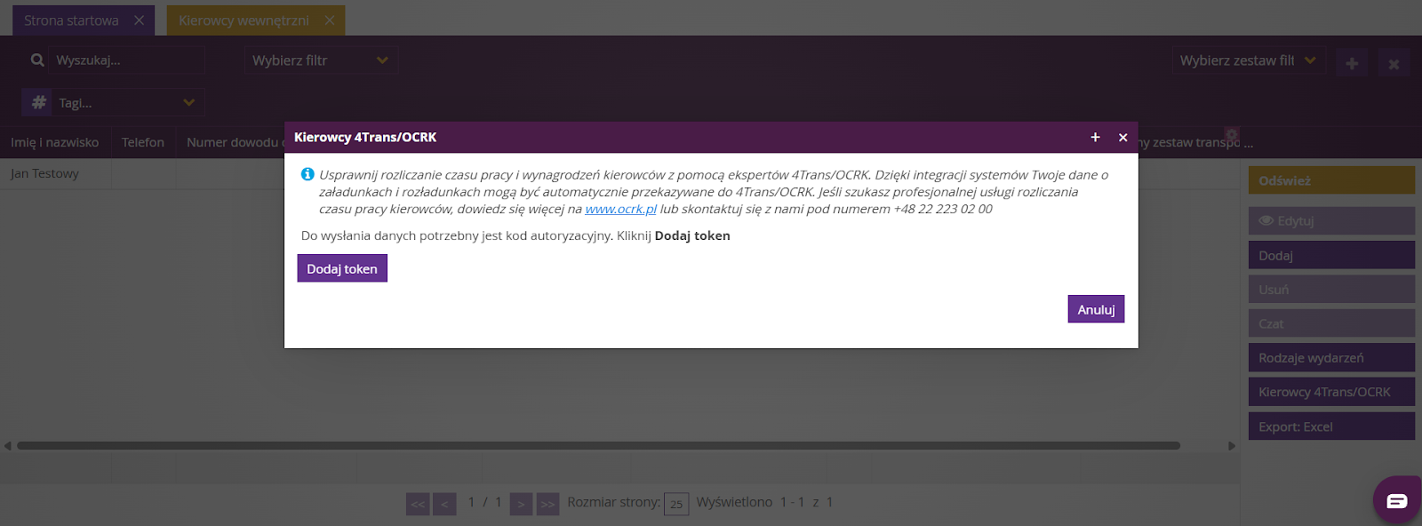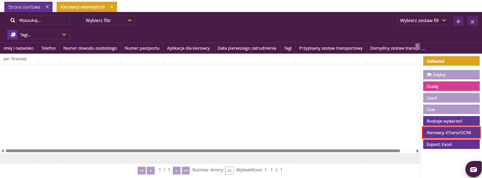 W widoku listy kierowców, po prawej stronie, wybierz Kierowcy 4Trans/OCRK.