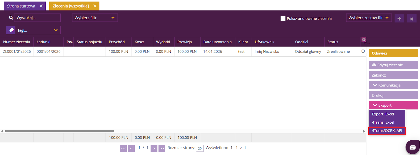 Następnie kliknij Eksport >> 4Trans/OCRK: API.