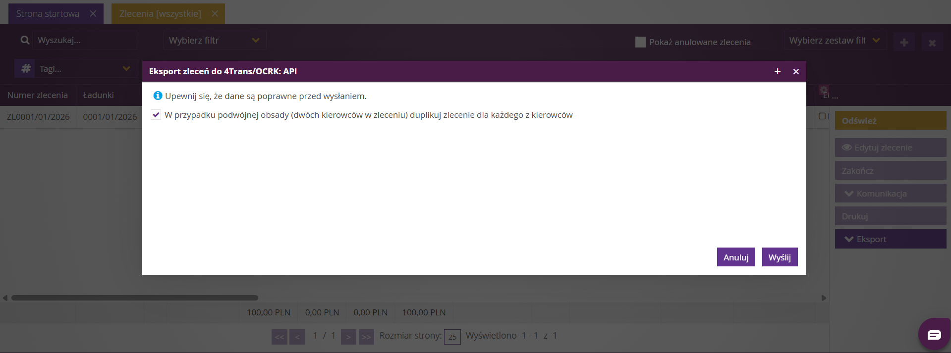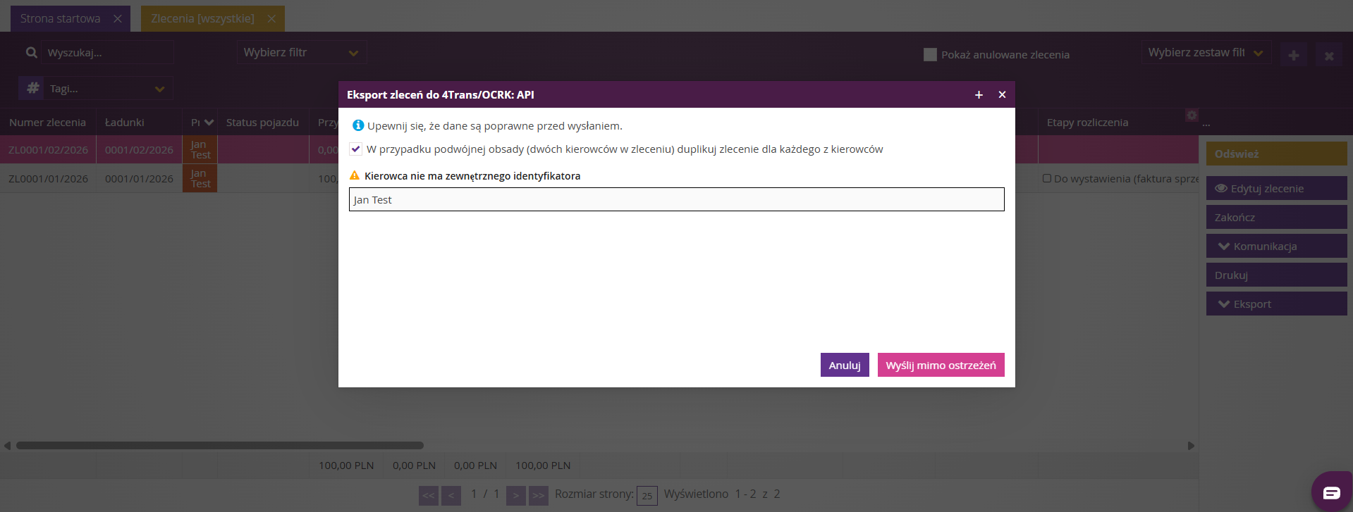 Uwaga: Do systemu 4Trans zostaną wysłane wszystkie zlecenia widoczne na liście, zgodnie z aktualnie ustawionymi filtrami.Potwierdzenie wysyłki danych