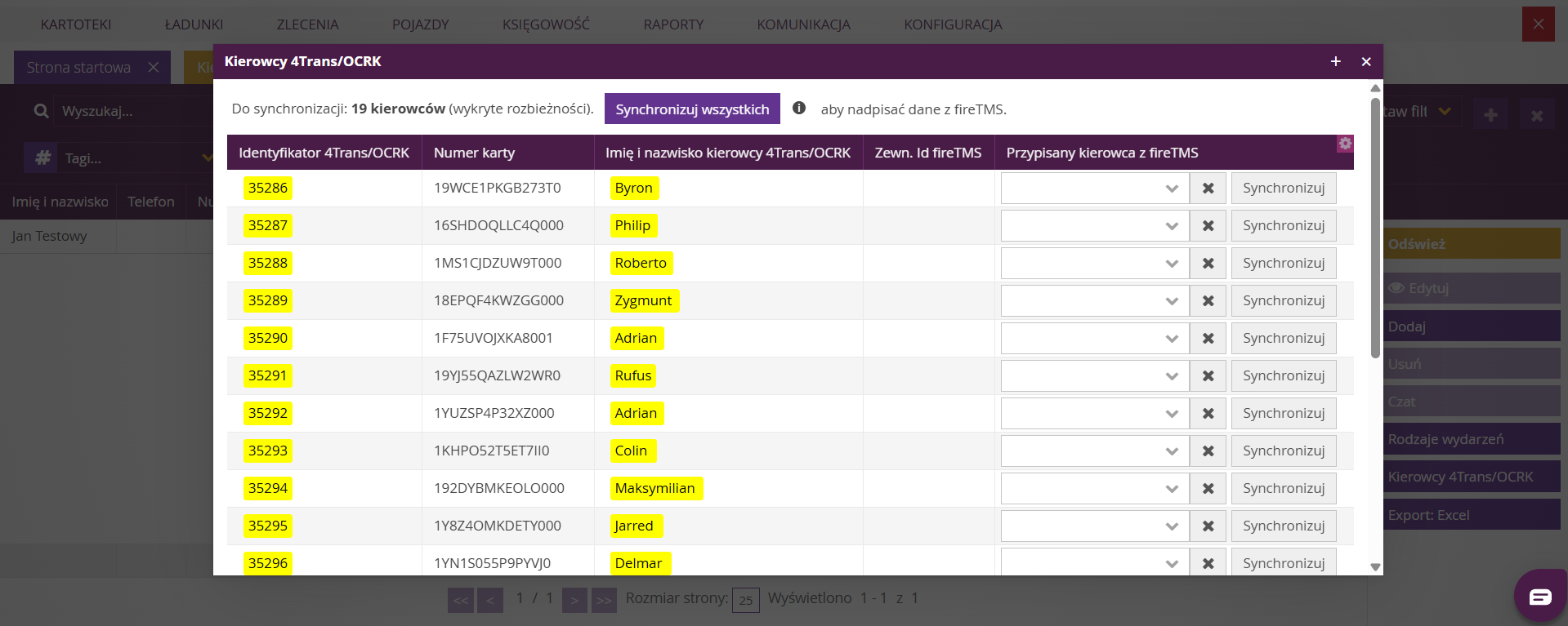- utworzyć brakujących kierowców w fireTMS,