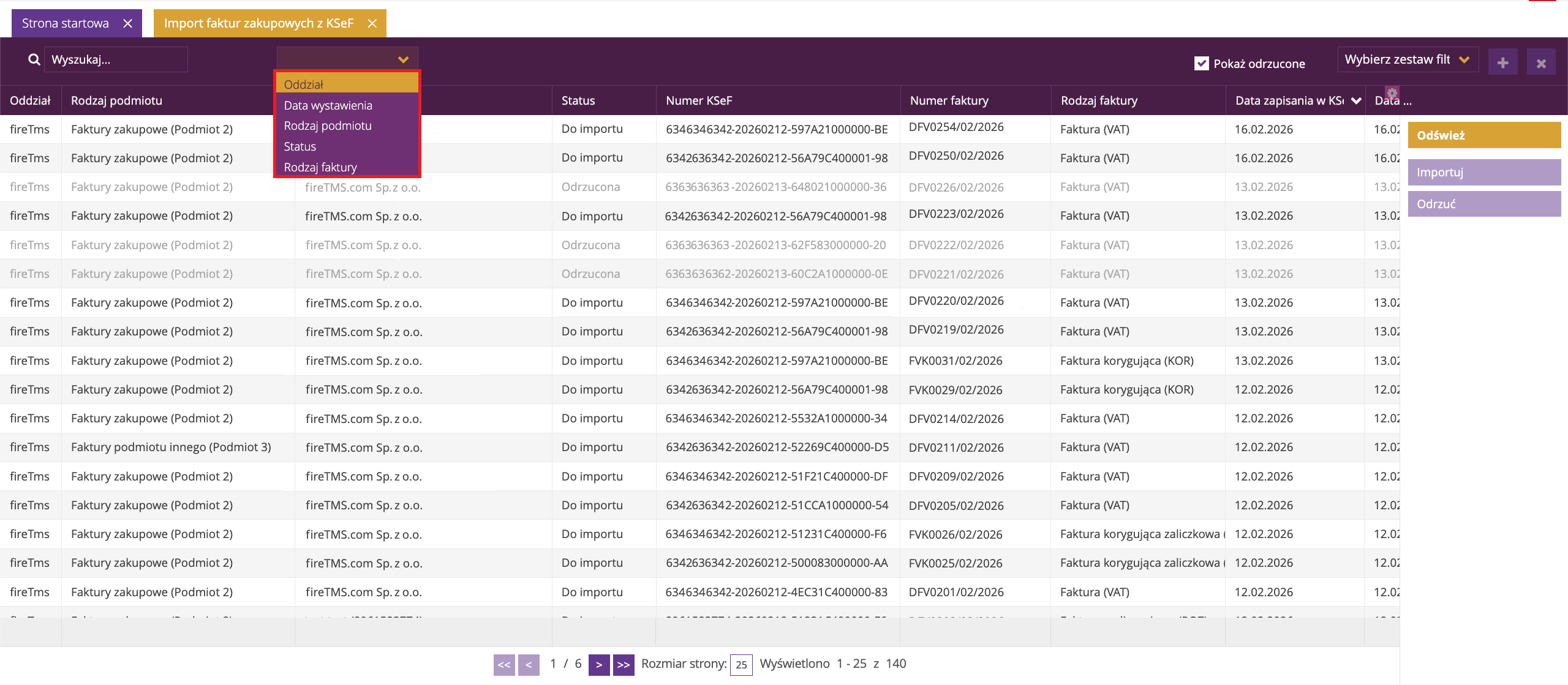 Za pośrednictwem systemu fireTMS możliwy jest podgląd faktur zakupowych pobieranych z Krajowego Systemu e-Faktur (KSeF), wystawionych na oddziały firmy.